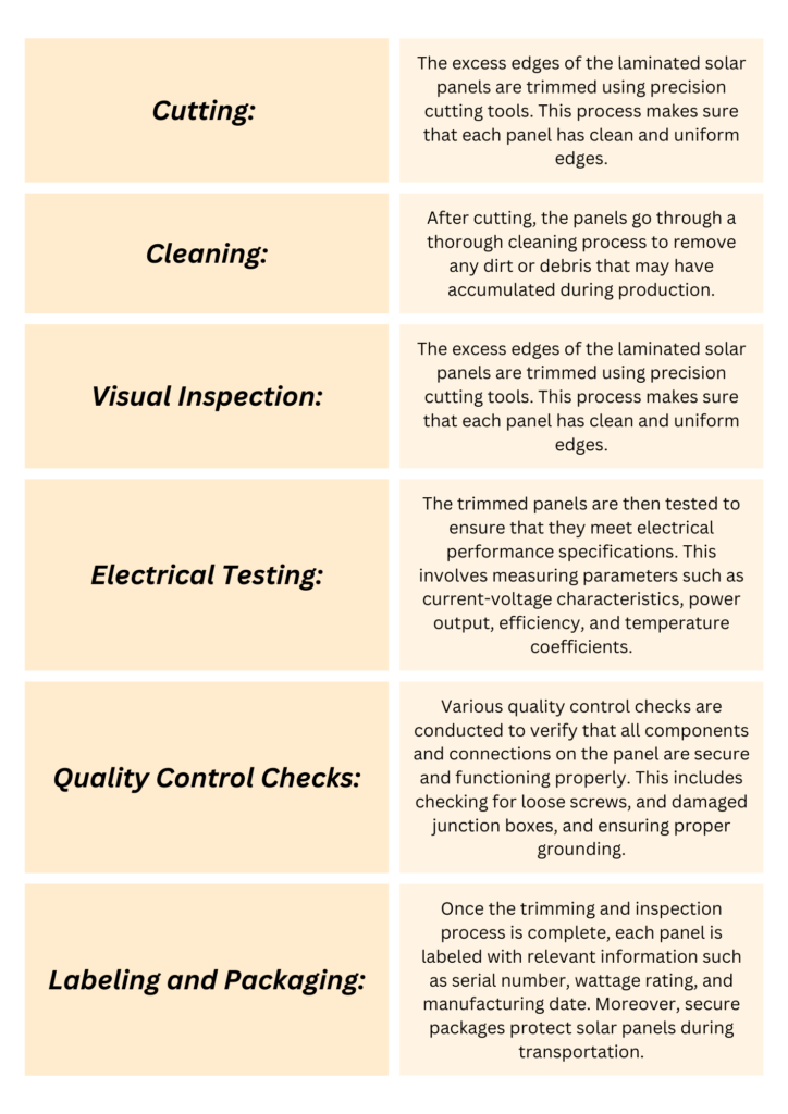 After laminating the solar panels, the next step in the manufacturing process is trimming and inspection. This stage looks into how panels meet the required specifications and quality standards before shipping to customers. Here are the key steps in trimming and inspection: